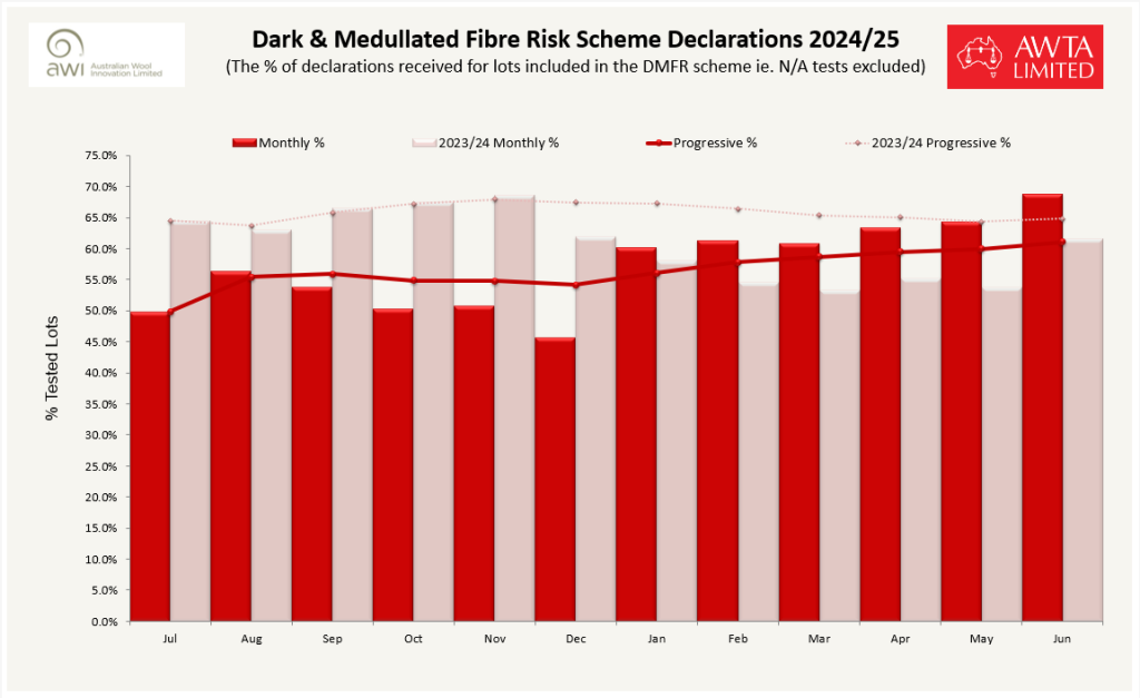 L'International Wool Textile Organisation (IWTO), attraverso la sua affiliata australiana, Wool Industries Australia (WIA), si batte per proteggere la reputazione della pregiata lana bianca Merino australiana gestendo il rischio di contaminazione da fibra scura e/o medullata (DMF). Il programma opera attraverso dichiarazioni volontarie rilasciate dai produttori di lana sulle specifiche dei classificatori che accompagnano le consegne di lana ai magazzini degli agenti di vendita e dei broker. Queste informazioni vengono inoltrate all'AWTA, che calcola la classificazione del rischio di fibre scure e maculate (DMFR) e la riporta sul certificato del test Yield & Micron. Il punteggio DMFR viene quindi visualizzato nei cataloghi di vendita in modo che gli acquirenti possano fare acquisti consapevoli.